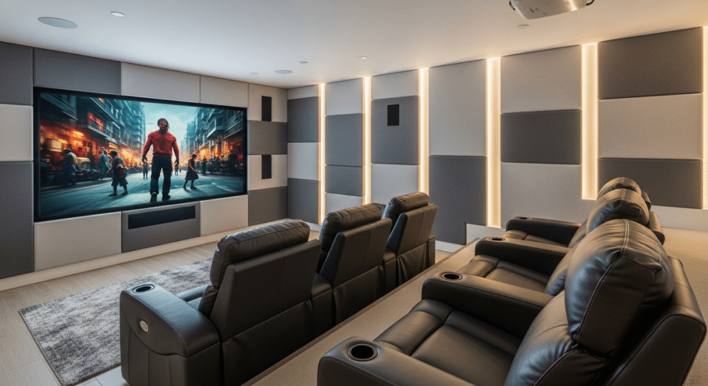 Premium home cinema with 4K laser projection, Dolby Atmos sound, automated lighting, and integrated smart home control.
