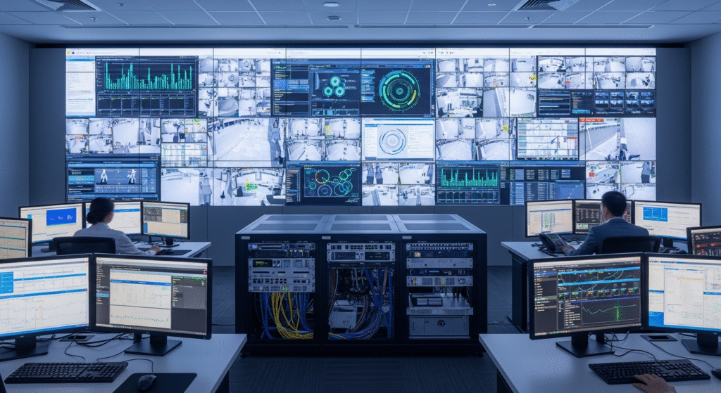 Mission-critical operations centers with real-time data visualization, surveillance feeds, and system monitoring.